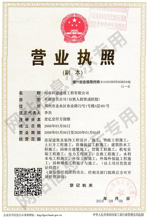 河南科建建設工程有限公司是一家以房屋建筑、建筑裝飾、建材貿(mào)易及大型建筑機械設備租賃為主營業(yè)務的成長型企業(yè)。擁有建筑工程總承包壹級資質(zhì),裝飾裝修、防水防腐保溫等專業(yè)承包壹級資質(zhì),注冊資本1.1億元。